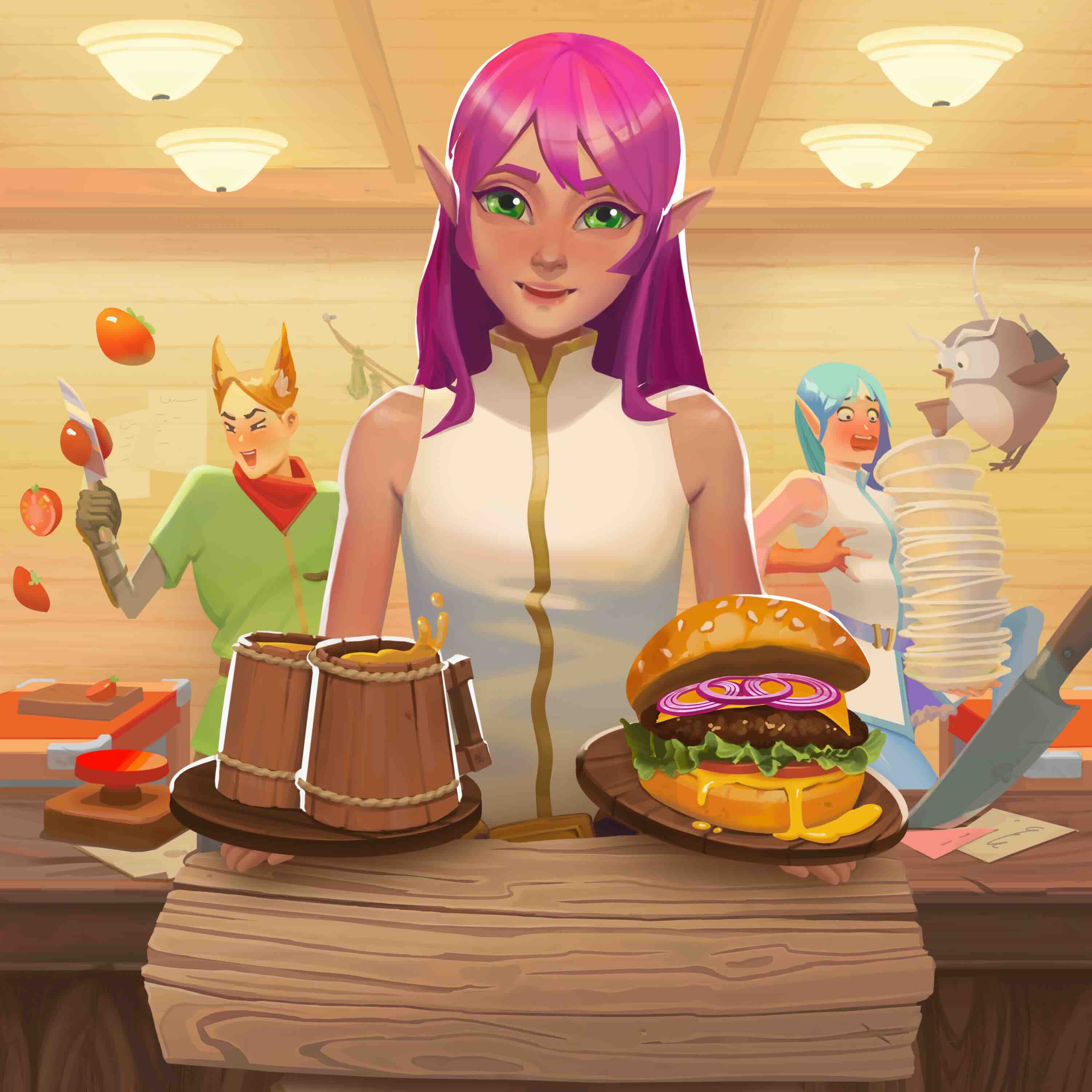 Погрузитесь в шумную атмосферу таверны фэнтезийного города! Готовьте блюда, разливайте напитки и быстро обслуживайте гостей. Чем слаженнее работает команда, тем больше довольных посетителей. Успех зависит от командной работы и грамотного распределения ролей!
